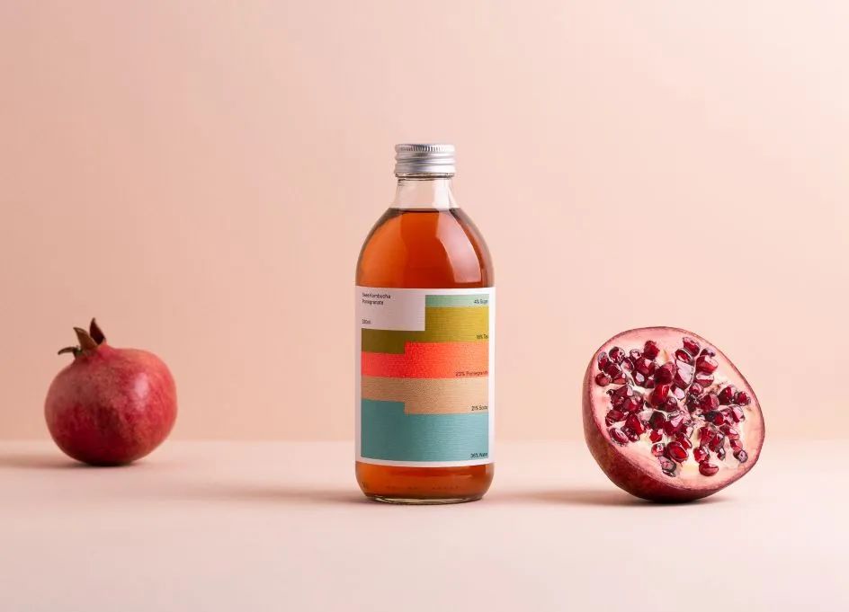 ● Swee Kombucha 的益生菌酿造产品,100%天然,包装设的每个单元填充一种颜色,代表每种成分的百分比。设计:Bedow 工作室。