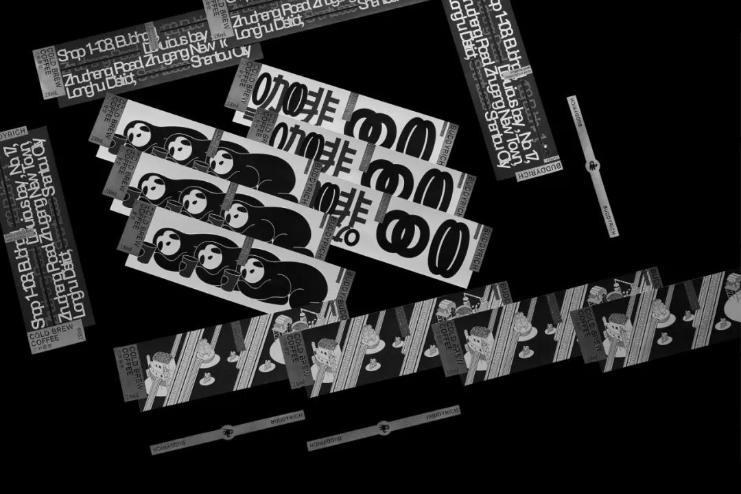 在设计中,设计方将中英文字体、品牌 IP 形象、咖啡店地址、城市建筑地标插画等多次复制重叠的实验尝试。多种元素以不同的错位混合排版,暗示着品牌的多元混合个性,以这个概念引导到整套设计中关于字体、插图拆分、重组、多元、混搭的思考。