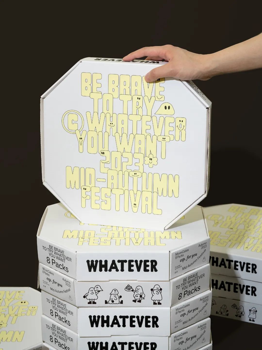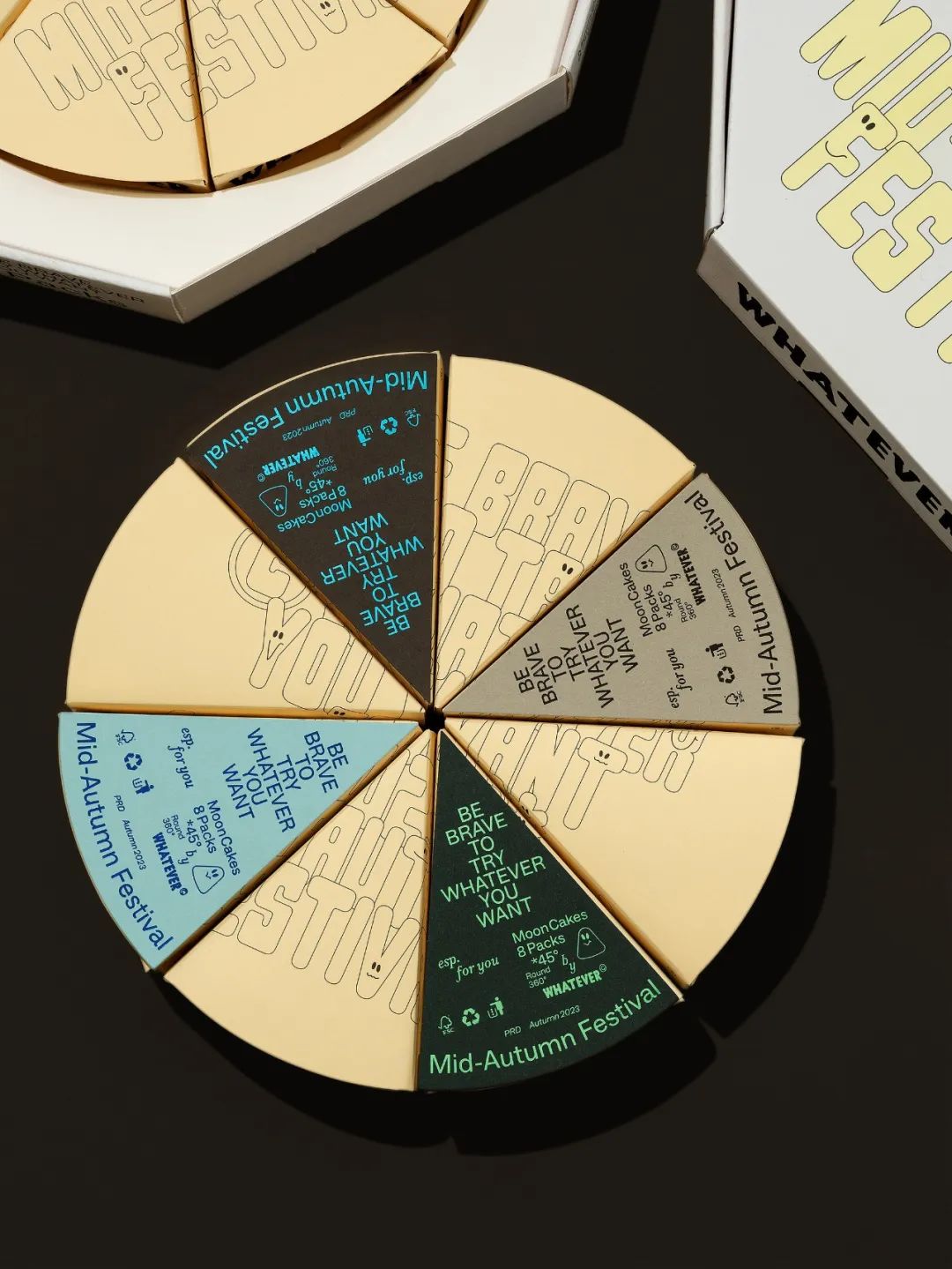 qidoo design 想回归初心,尝试把传统中秋礼盒与现代元素结合:月饼装进「披萨盒」,寓意像吃披萨一样轻松分享月饼的美味,关注此时此刻在一起。礼盒设计兼顾实用和方便,披萨盒将人立刻拉回温情与分享的场景。