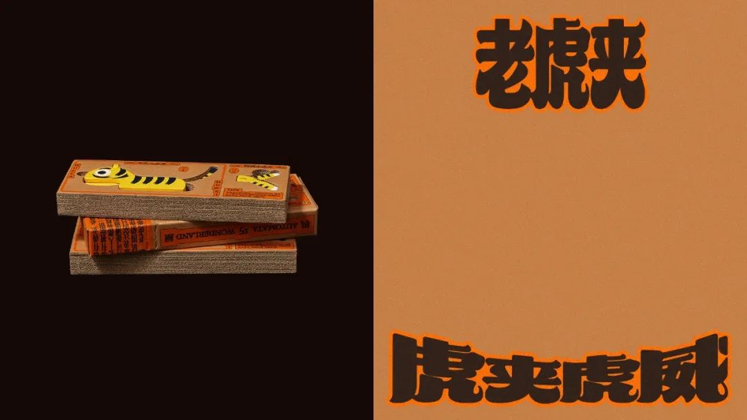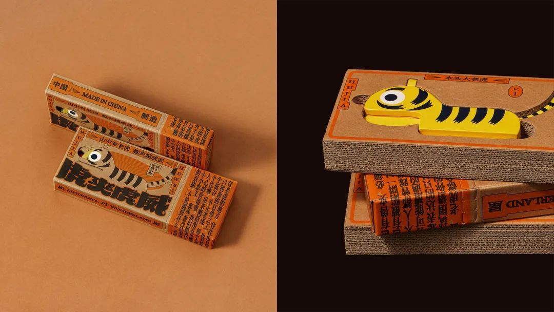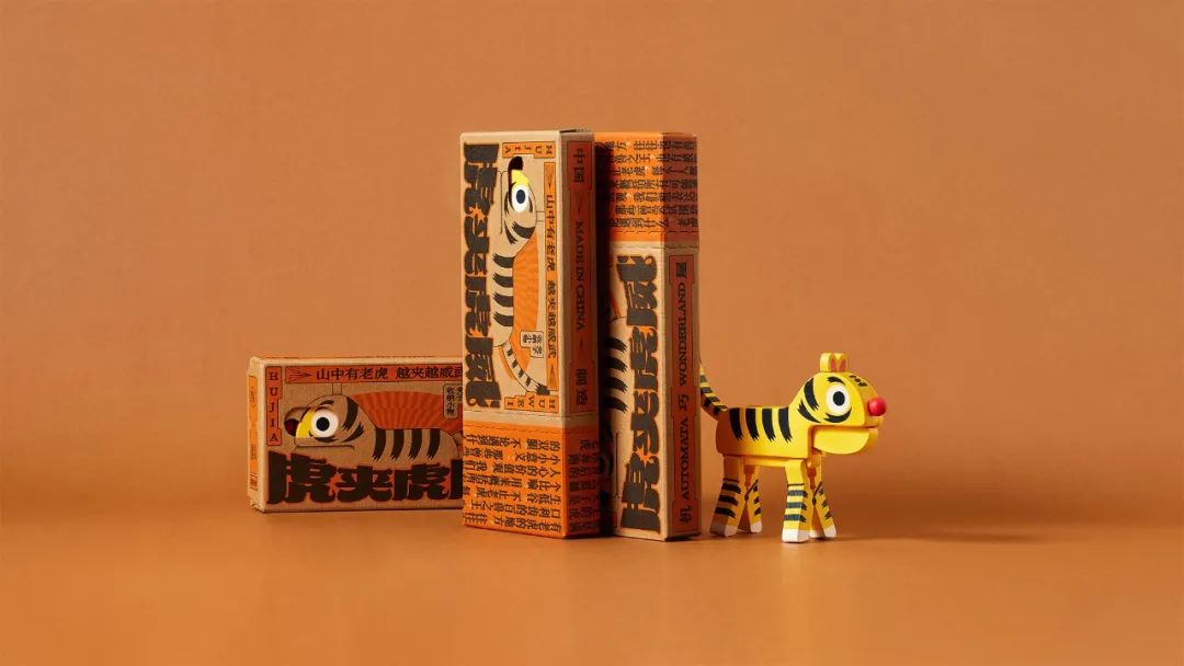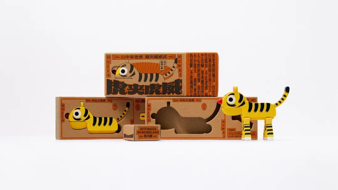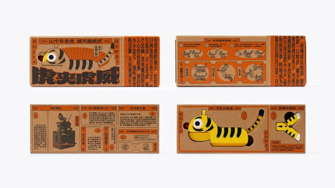 虎夹虎威玩具包装的灵感来自创作者俞宸睿的机巧装置作品《武松打虎》,它像是一盒复古连环画套装,充满了趣味和传统故事的年代感。