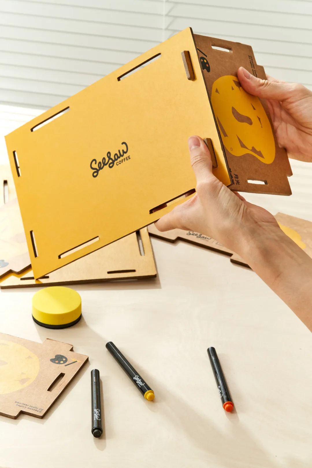 瓦楞纸的叠加组合,模拟了木块的质感,产品嵌入在瓦楞卡槽内,是为了呈现玩具脱胎于木块的形式。此外,标题字体设计与内容还原了复古画册的特点,也结合了有趣的编排设计。