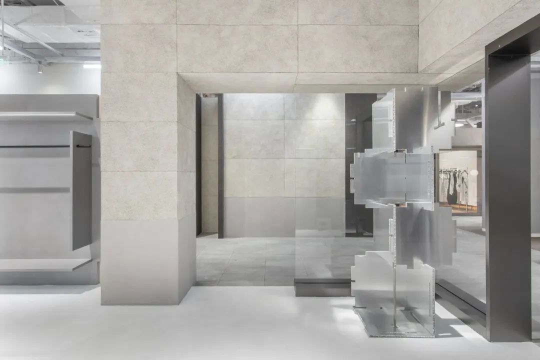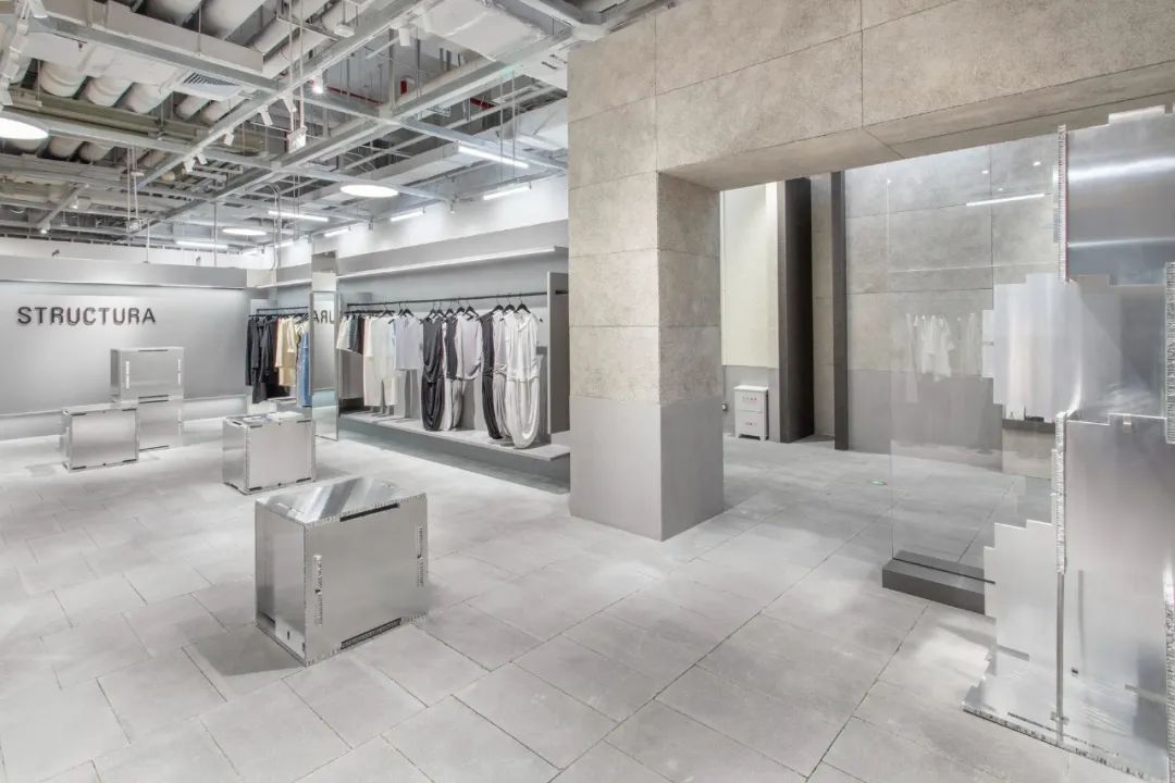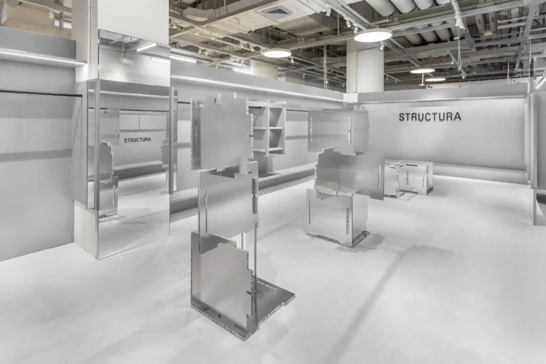 活络空间设计事务所根据 STRUCTURA 的灰色礼盒,把店铺空间设计比拟为打开盒子的过程。在道具设计上,设计了一组拼插模块道具,在实际的使用中,这种结构鼓励使用者根据空间不同的场景需求,自由地组装、变换道具的造型,这也适应了 STRUCTURA 各种零售形式的实际需求。